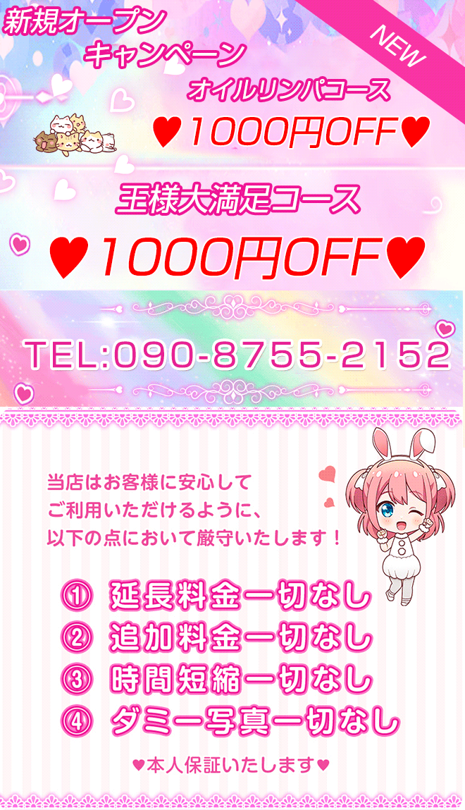 当店では、アロマオイルの効能と当店自慢のセラピストによるリンパマッサージの相乗効果による、癒しのひとときをお客様お一人お一人にお届けしております、自然で心やすらぐ優美な香りを、施術中はもちろんご帰宅お休みになってから翌日朝目覚めでまで楽しんで頂けます、どうぞゆっくりご堪能ください。